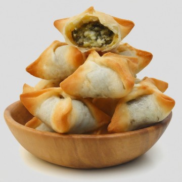 <p>Layers of phyllo dough with a filling of seasoned feta cheese and spinach.</p>