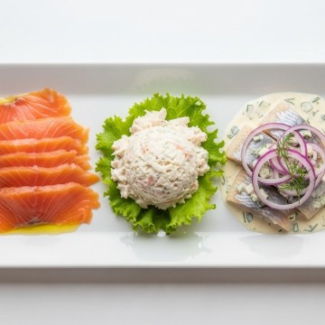 <p>An elegant display of freshly sliced smoked salmon beautifully placed on a tray with three types of cream cheeses, sliced red onion, capers, sliced plum tomato, sliced lemon, dill, cucumber and a tray of mini assorted bagels.</p>