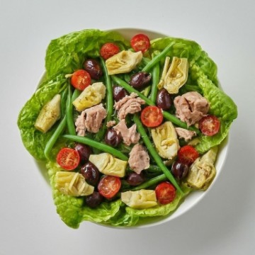 Romaine lettuce, artichoke hearts, water tuna, green beans, cherry tomatoes, olives and Italian dressing.