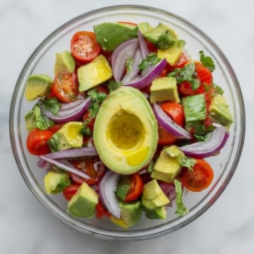 Avocado, tomatoes, sliced red onions with cilantro and olive oil. A best seller!